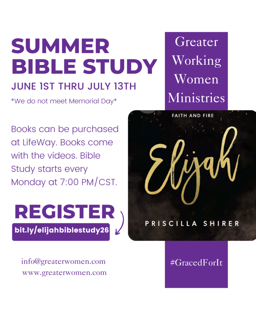 Get ready for our summer Bible study starting June 1st. We will be studying Elijah. It can be purchased at www.lifeway.com.