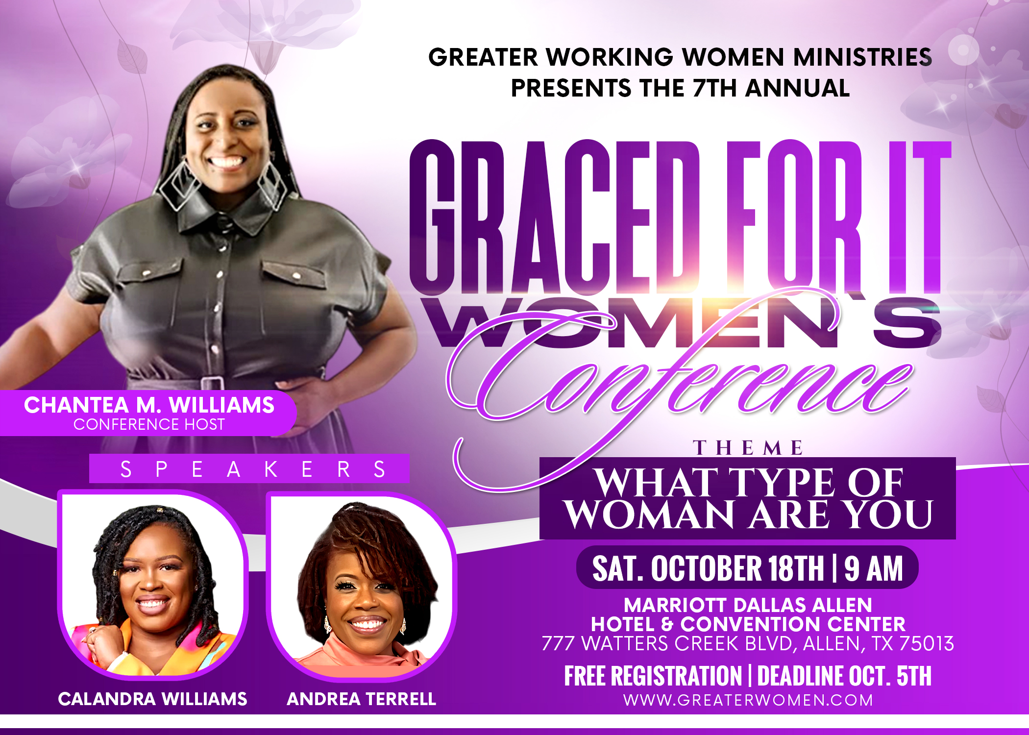 Our 7th annual women’s conference, Graced For It, will be held in TX on October 18, 2025. Our theme is What Type of Woman Are You? Come casual and ready to receive what the Lord has specifically for you! We will have a product table to purchase books, t-shirts, and other items. If you have never experienced the Graced For It Conference, you want to come to year seven! This is the Texas Takeover continuation! There will be no virtual option. You must be in the place! We will be at the Marriott Dallas Allen Hotel and Convention Center in Allen, TX.